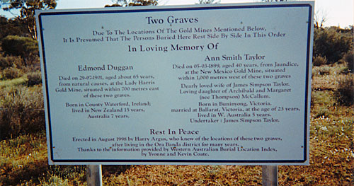 Rest Places: Bonnie Downs Station, Broad Arrow Kurawah Cemetery, Edjudina Station Cemetery, Forrest River Mission East Kimberley, Goongarrie, Karridale Pioneer Cemetery, Lady Harris Gold Mine, Mt Churchman Bimbijy Station Mt Marshall, Mt Elizabeth Station homestead Kimberley, Mt Newman Cemetery, Mulline Cemetery, Onslow Pioneer Cemetery, Popanyinning, Round Swamp Tenterden, St Paul's Church Arthur River, Sturt Creek Station Homestead, Well 37 Canning Stock Route, Well 40 Canning Stock Route, Wickepin Pioneer Cemetery, Yorkrakine